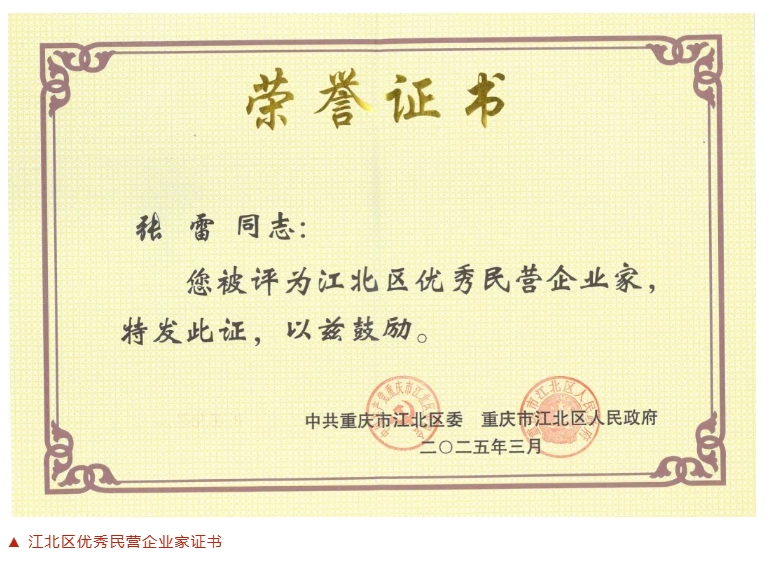 近年來,張雷董事長帶領企業及全體員工堅持以習近平新時代中國特色社會主義思想為指導,深入落實習近平總書記視察重慶重要講話指示精神,以敢闖敢拼的魄力錨定發展坐標,以求新求變的智慧破局行業變革,以實干篤行的韌勁深耕城市沃土,在推動江北區經濟發展中發光發熱,書寫著新時代民營企業的擔當作為。