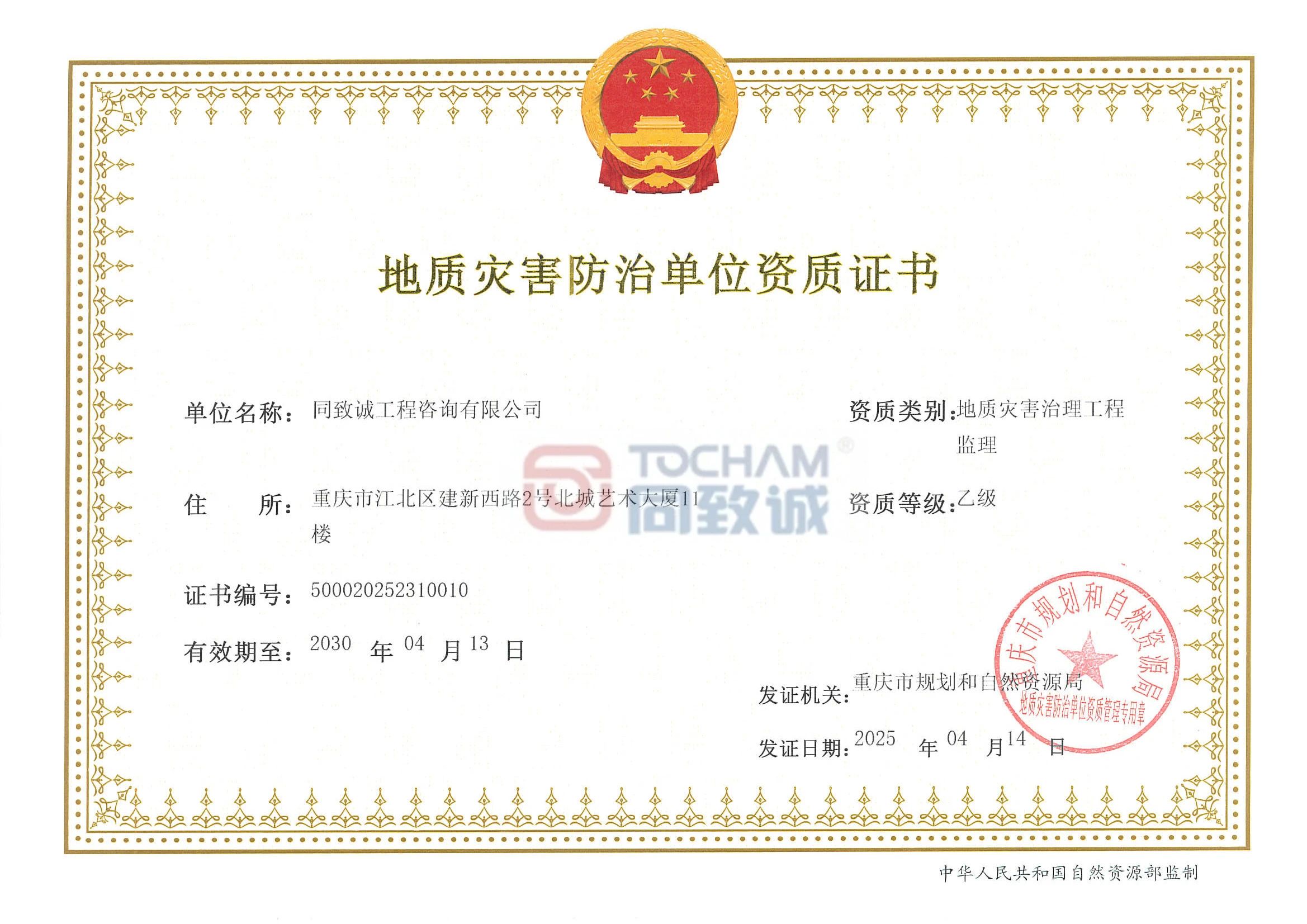 近日,經(jīng)重慶市規(guī)劃和自然資源局批準(zhǔn),同致誠(chéng)工程咨詢有限公司迎來(lái)喜訊,成功取得地質(zhì)災(zāi)害治理工程監(jiān)理乙級(jí)資質(zhì)。