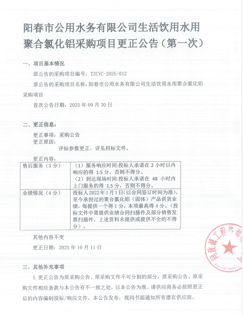 陽春市公用水務有限公司生活飲用水用聚合氯化鋁采購項目更正公告(第一次)