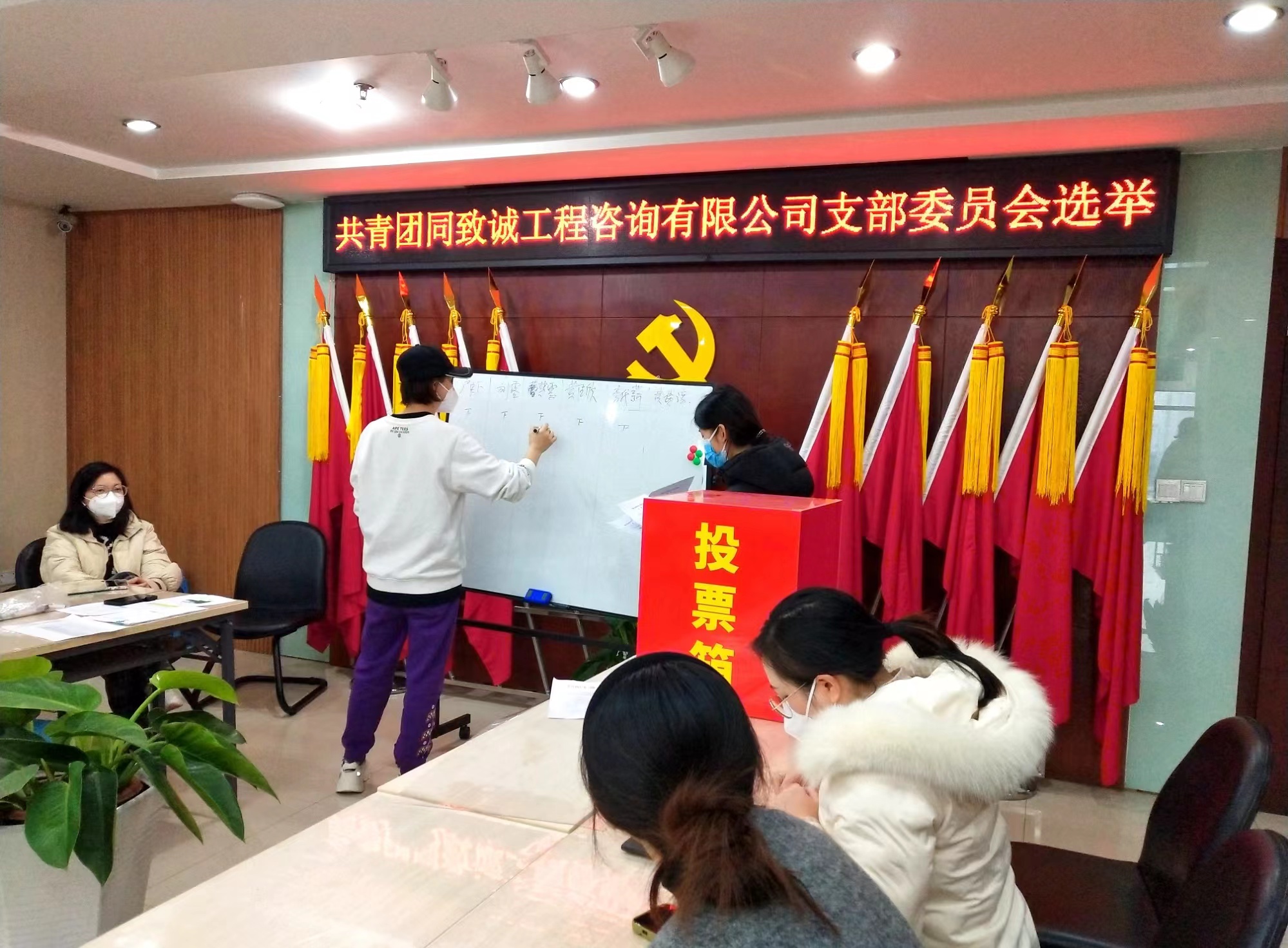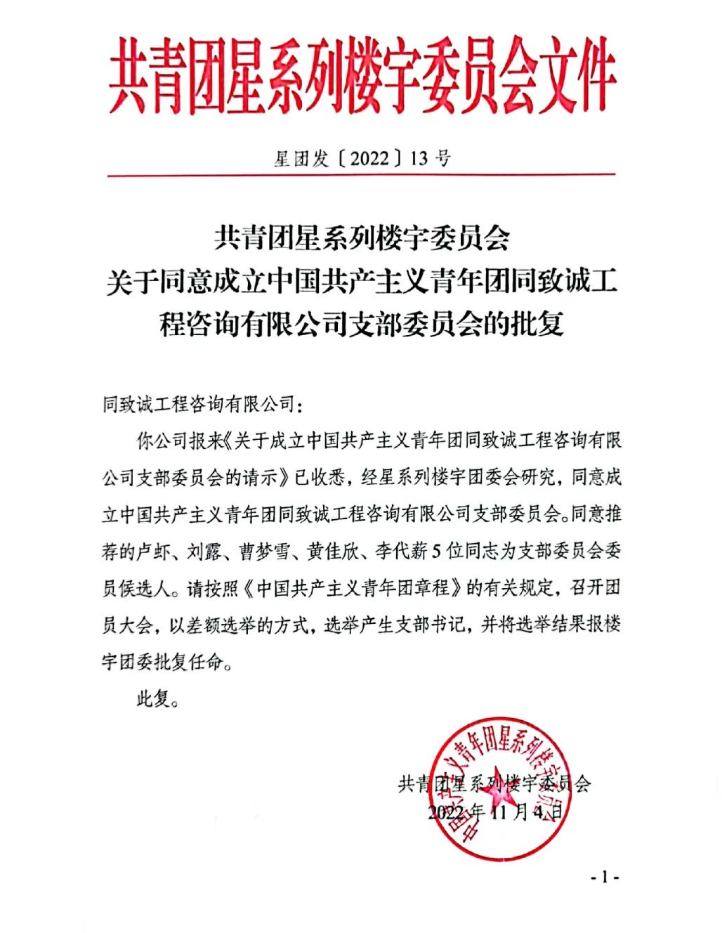 同致誠第一次團員大會上,首先宣讀了共青團星系列樓宇委員會《關于同意成立中國共產主義青年團同致誠工程咨詢有限公司支部委員會的批復》。隨后,與會團員以無記名差額選舉的方式投票產生了第一屆支部委員會成員,由盧蝦同志任書記,劉露同志任組織委員,曹夢雪同志任宣傳委員,黃佳欣同志任紀檢委員,李代薪同志任青年委員。