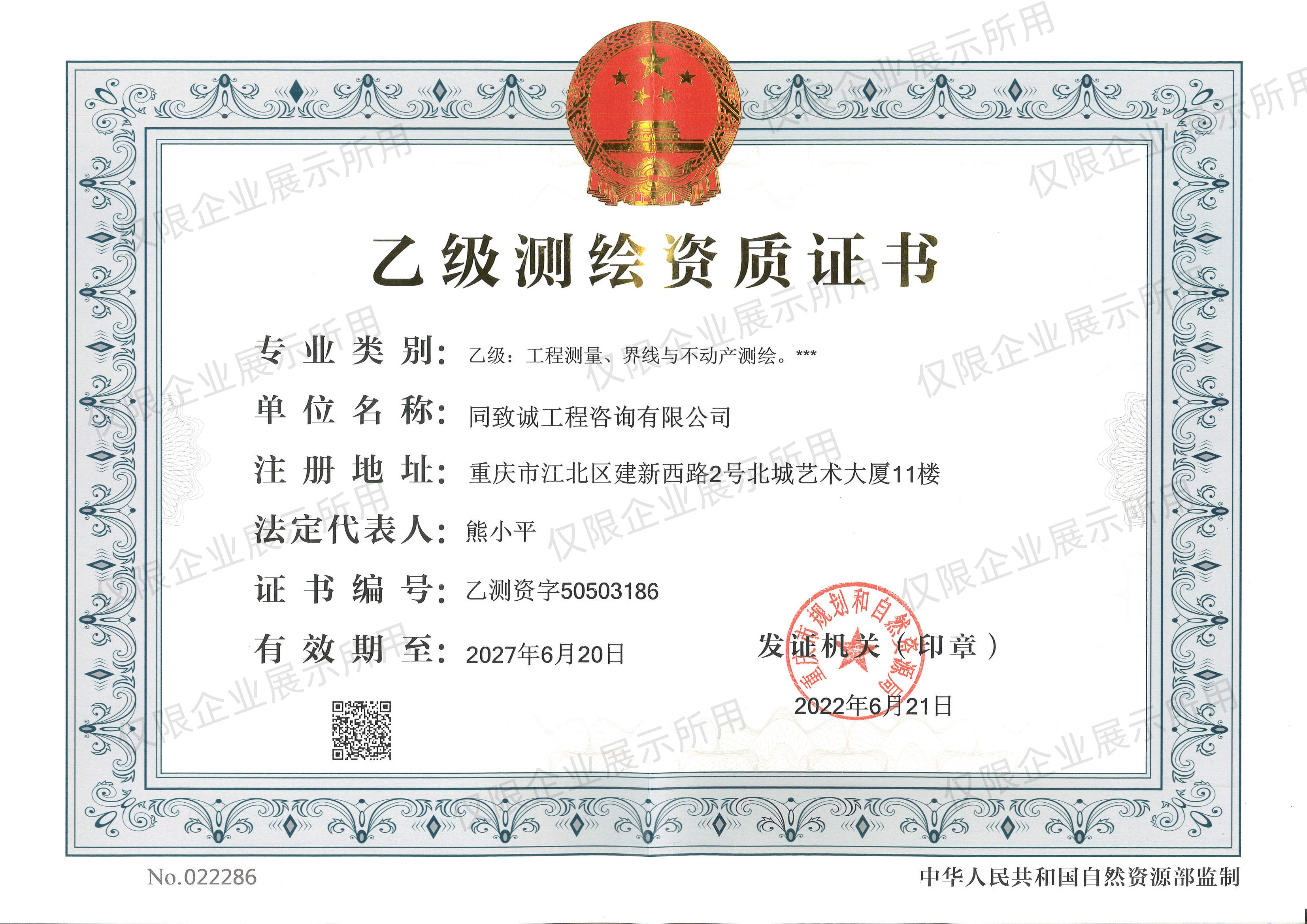 自準備申報測繪資質以來,公司積極梳理測繪人員,組織人員參加國家地理信息安全保密培訓,查找公司的測量設備相關資料,完善測繪技術和質量保證體系,建立測繪地理信息安全保障措施和測繪成果和資料檔案管理等制度,在人員、設備、制度、設施都做了充足準備,經過系統申報、嚴格審核等環節,最終經重慶市規劃和自然資源局審批通過后頒發證書。
