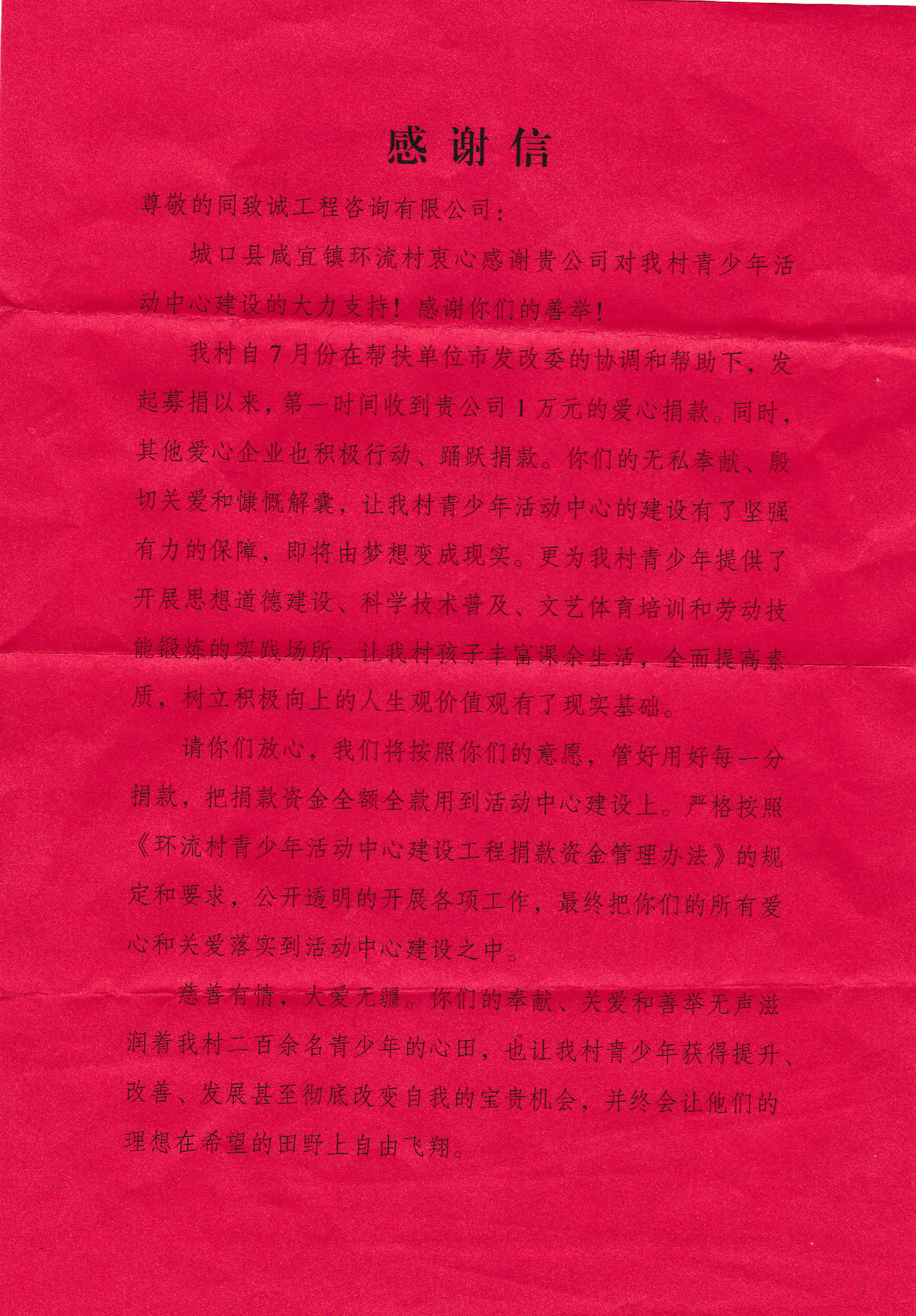 信中提及,城口縣咸宜鎮(zhèn)環(huán)流村為建設(shè)青少年活動(dòng)中心在幫扶單位市發(fā)改委的協(xié)調(diào)和幫助下發(fā)起募捐。我司于第一時(shí)間獻(xiàn)出愛(ài)心,希望為孩子們的活動(dòng)中心添磚加瓦。信中還表示,將管好用好每一分捐款,把捐款資金全額全款用到活動(dòng)中心建設(shè)上,公開(kāi)透明的開(kāi)展各項(xiàng)工作。