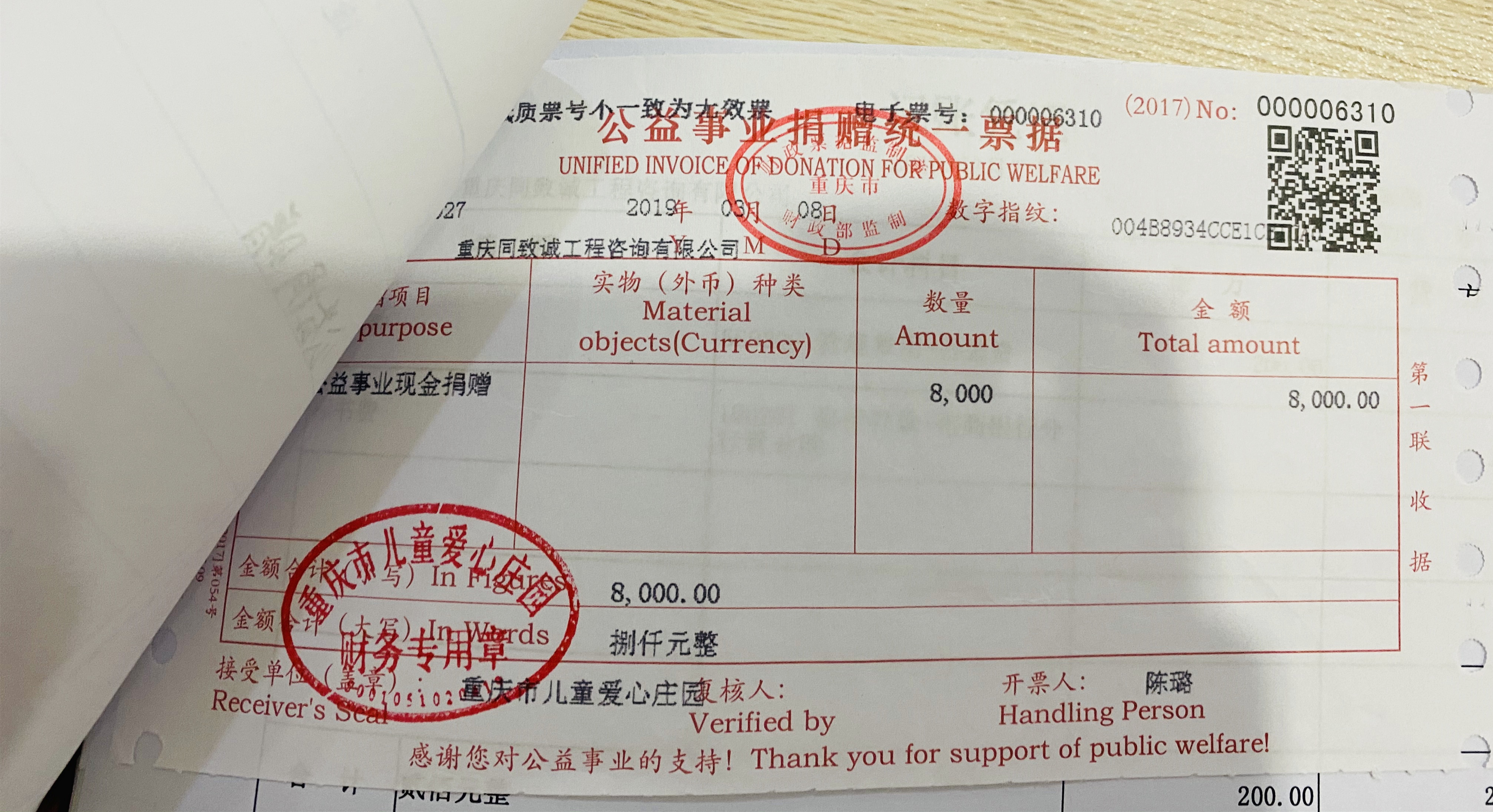 圖 | 為重慶市兒童愛(ài)心莊園愛(ài)心捐贈(zèng)的票據(jù)