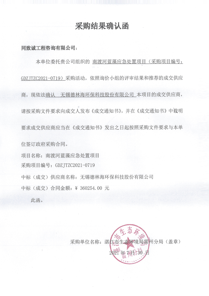 南渡河藍(lán)藻應(yīng)急處置項目-采購結(jié)果確認(rèn)函