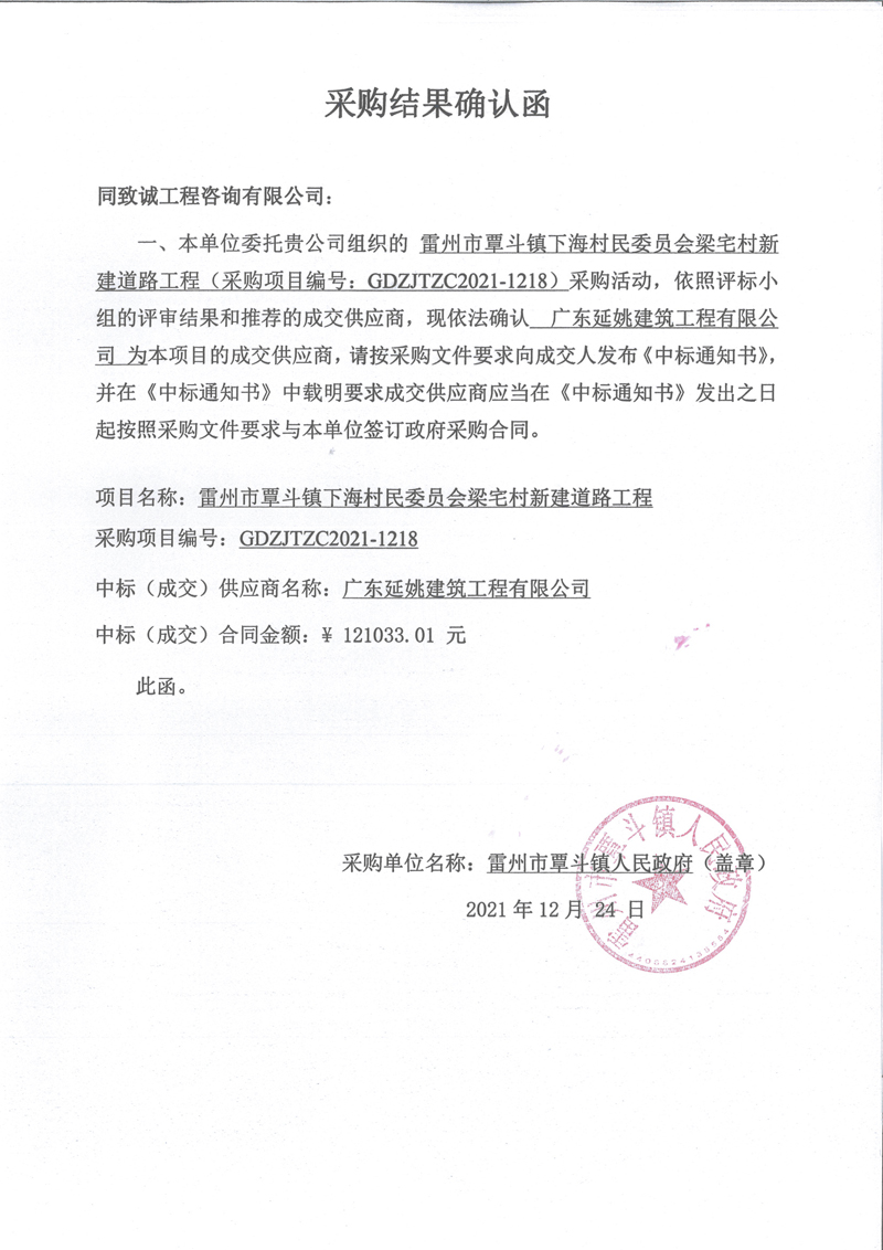 雷州市覃斗鎮下海村民委員會梁宅村新建道路工程 采購確認函