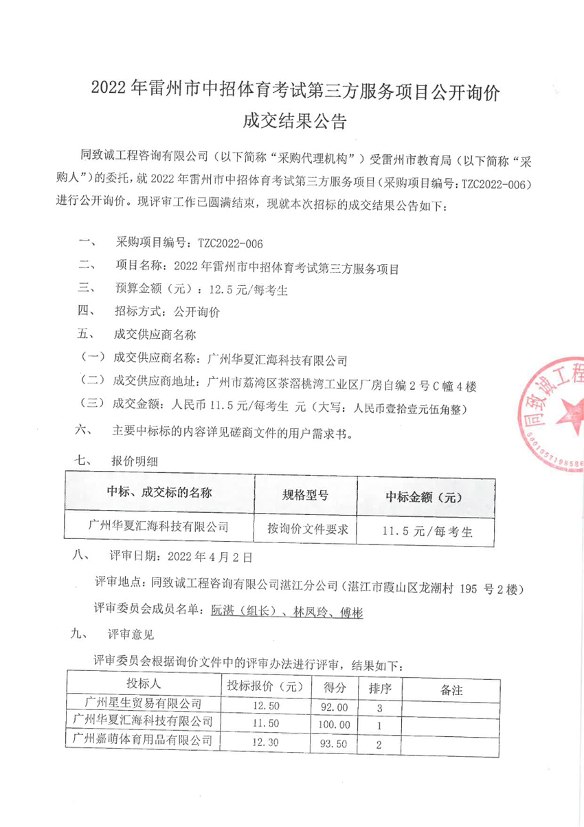 2022年雷州市中招體育考試第三方服義項目中標公示