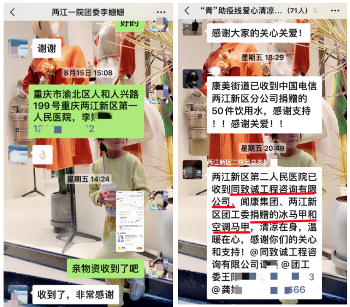 高溫送清涼,同心戰疫情。同致誠總部積極響應兩江新區團工委組織發起的“‘青’助疫線·送愛心送清涼”活動,做好一線工作人員后勤服務保障及防暑工作,分別向重慶兩江新區大竹林街道團工委、火車北站地區聯合團委、重慶兩江新區第一人民醫院團委、重慶兩江新區第二人民醫院團總支捐贈核酸采集降溫冰馬甲及核酸采集帶充電帶風扇馬甲,總價值5407元。