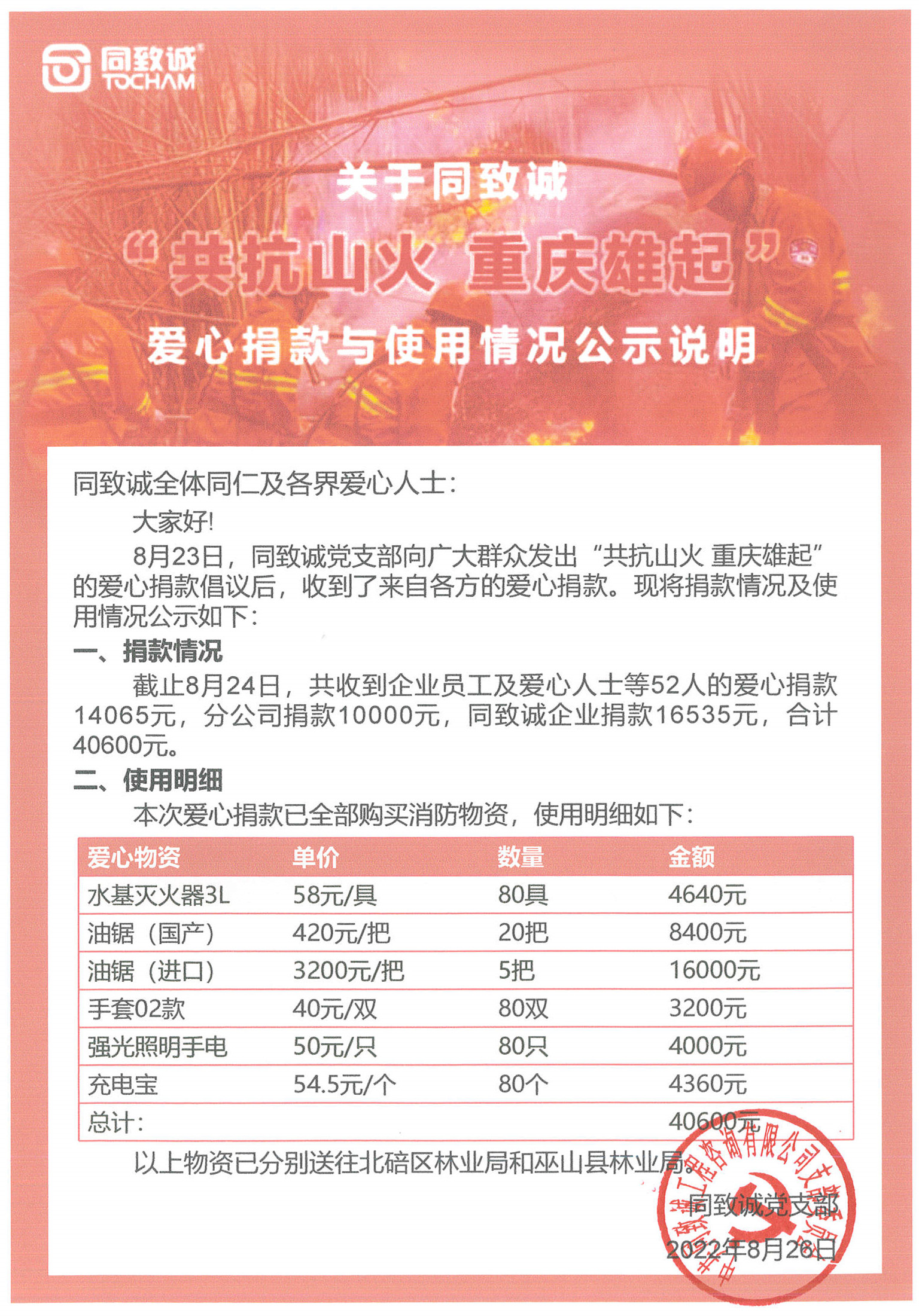 8月23日,同致誠黨支部向大家發出“共抗山火 重慶雄起”的愛心捐款倡議后,收到了來自各方的愛心捐款。截止8月24日,共收到企業員工及愛心人士的愛心捐款14065元,分公司捐款10000元,同致誠企業捐款16535元,合計40600元。